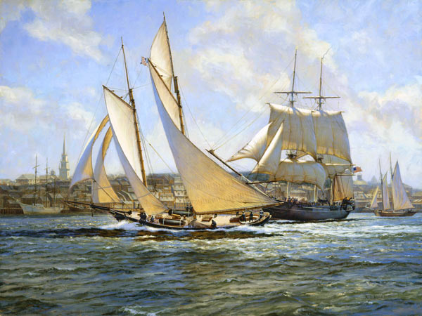 "The "America" and sloop of war "Marion" leave Boston in the summer of 1863." | During a summer cruise of 1863, "America", acting as a United States Naval Academy training ship for midshipmen together with the sloops of war "Marion" and "Macedonian", visited Boston. In the painting, "America", with all sails pulling hard in the fresh breeze' sails across the bow of the sloop of war "Marion". "Marion" is still busy lowering her foresail and mainsail and hoisting one of her jibs. She is sailing under a reduced rig with no yards "crossed" on the topmast sections. On board "America" can be seen the 24 pounder Dahlgren deck guns that she carried to apprehend Confederate blockade runners. Sections of her deck are wet from water splashing aboard. Crew are hauling in the jib sheet on the port side for'ard. A cloud casts a shadow on the foreground water but sunlight lights up the water around "America" and "Marion" and creates a wonderful glow through "America's cotton sails. The old North Church, in the background is also sunlit but a shadow passes over the buildings and ships along part of the waterfront. Trees can be seen on Cropp's Hill, behind the "Marion". On the right hand side a schooner's sails flap as she tacks. She has furled her jib in preparation for anchoring.