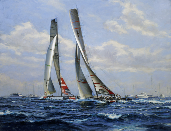 "A Decisive Race. Race 7 for the America's Cup between "Alinghi" and "New Zealand". | Nearing the top mark on the second to last leg of race 7, "Alinghi" caught "New Zealand" on starboard.This was a decisive moment of the race and thus the America's Cup 2007, as the penalty turn that "New Zealand" was penalised with enabled "Alinghi" to win the race and thus the America's Cup 2007.