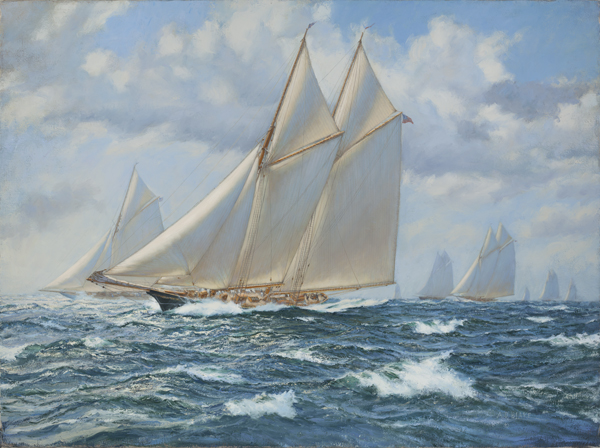 "Constellation" makes a record breaking run on the New York Yacht Club Cruise of 1895. | The painting depicts the 131 foot steel centreboard schooner "Constellation" ( owned by Bayard Thayer) charging through large sun sparkled seas, lee rail down and leaving a huge foaming wake, to make a record breaking run, averaging 13.88 knots, on the run from Huntington Bay to New London during the New York Yacht Club Cruise of 1895. In the strong winds she has 'working sails' up only with her jib topsail furled against the bowsprit.