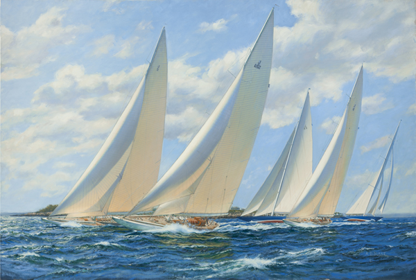 The painting depicts the scene, not long after the start, as the yachts tack along the Marblehead Neck shore. It is a beautiful day and the sun is reflecting off the tops of the waves.Wonderful warm colors are created where the sun's light passes through the canvas sails. The shadowed areas appear a contrasting cool dark color.