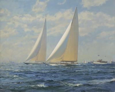 "Endeavour II" and "Ranger" at the start of the 3rd America's Cup race, 1937. THE MARINE ART OF A D BLAKEAD Blake's oil paintings range from historical maritime scenes to present day yachting events. His subjects vary from the beautiful historic square-rigged sailing ships and gaff-rigged classic yachts to the modern America's Cup racers. The paintings are often historic yachting harbour scenes, featuring New York, Newport, Nantucket, Marblehead, Boston, Cowes, Isle of Wight, Auckland and Venice; or blue water ocean races. The maritime art of Anthony Blake includes paintings of most of the America's Cup yacht races including the first race around the Isle of Wight won by the yacht "America". AD Blake's oil on canvas paintings are painted in a traditional painterly style. They are beautiful paintings of beautiful scenes. They are characterised by their impression of life and movement. The boats, with their sails, the sea, the sky and the background are exquisite in their details and multiplicity of colours. Some of the paintings have been reproduced as limited edition glicee prints. These editions are very limited and can be personalised with a unique pencil remarque. Please contact Anthony for further information on prints and paintings at adbblake@gmail.com or phone his cell phone +64 212952758. |