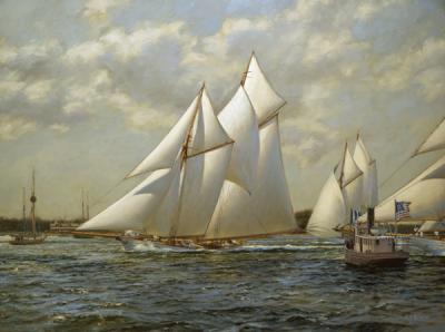 "Sachem", ( Commodore Frederick Adams) leads "Alcaea" and "Alert" across the startline at Larchmont Yacht Club, circa 1901. THE MARINE ART OF A D BLAKEAD Blake's oil paintings range from historical maritime scenes to present day yachting events. His subjects vary from the beautiful historic square-rigged sailing ships and gaff-rigged classic yachts to the modern America's Cup racers. The paintings are often historic yachting harbour scenes, featuring New York, Newport, Nantucket, Marblehead, Boston, Cowes, Isle of Wight, Auckland and Venice; or blue water ocean races. The maritime art of Anthony Blake includes paintings of most of the America's Cup yacht races including the first race around the Isle of Wight won by the yacht "America". AD Blake's oil on canvas paintings are painted in a traditional painterly style. They are beautiful paintings of beautiful scenes. They are characterised by their impression of life and movement. The boats, with their sails, the sea, the sky and the background are exquisite in their details and multiplicity of colours. Some of the paintings have been reproduced as limited edition glicee prints. These editions are very limited and can be personalised with a unique pencil remarque. Please contact Anthony for further information on prints and paintings at adbblake@gmail.com or phone his cell phone +64 212952758. |